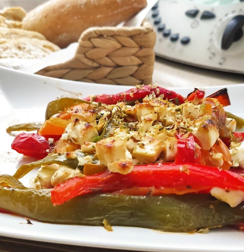 La verdad que no sabemos si hemos hecho un sacrilegio preparando de esta forma esta receta griega, pero por lo que hemos visto por internet no dista mucho de lo que hemos hecho.Hemos cocinado la receta en la slow cooker, por comodidad sobre todo, aunque se puede preparar también en el horno. En la olla lenta el queso no se funde, queda en su punto y los pimientos y tomate sueltan líquido que no se evapora y que no hemos añadido al plato. Cuando ha terminado su tiempo de cocinado, hemos dado un golpe de grill para que el queso se tueste un poco.