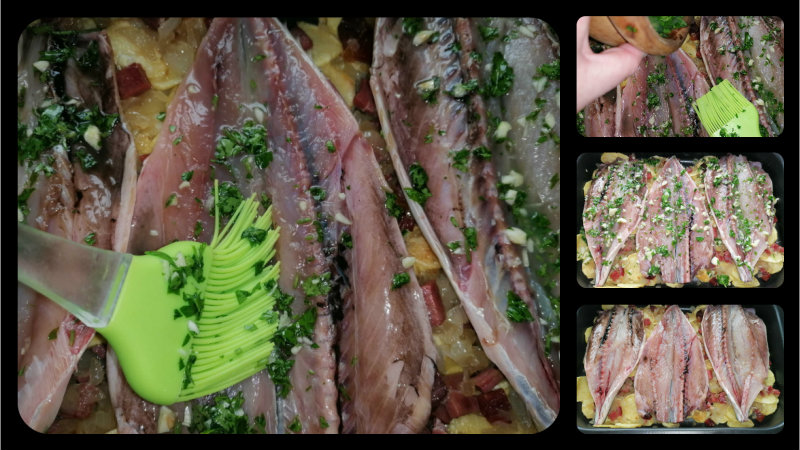 Ahora solo queda poner las caballas abiertas sobre las patatas y luego echar la mezcla del almirez, nos ayudamos de una brocha para impregnarlas bien con el resultado, si nos sobra líquido lo podemos echar por todas las patatas