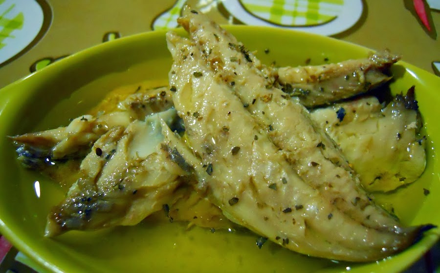 Sacar los lomos en un taper , laminarle unos ajos al gusto y espolvorearle perejil picado y cubrirlo con aceite de girasol.