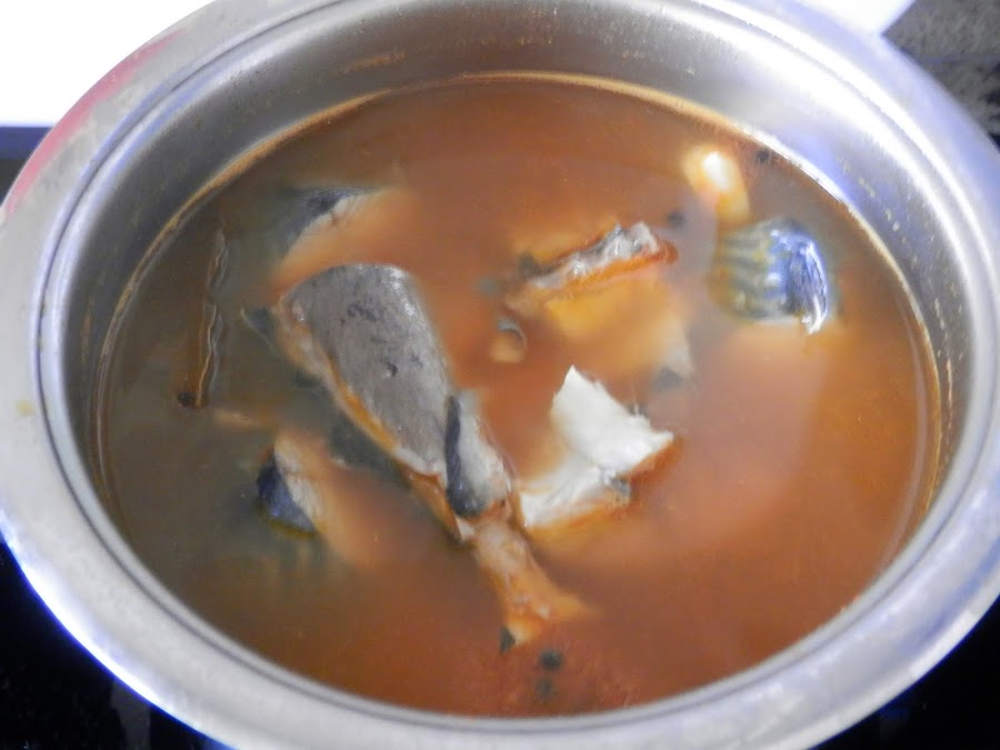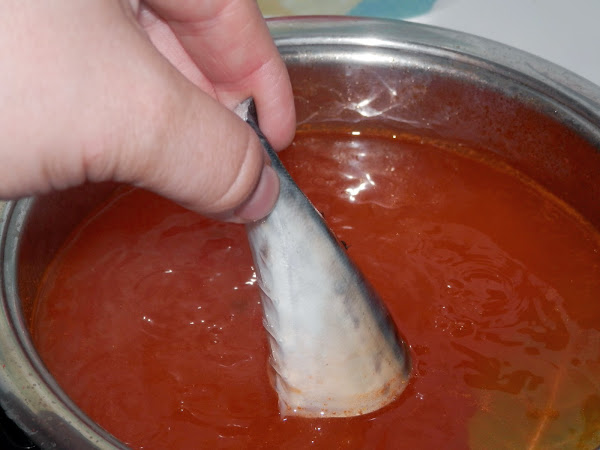 Ponemos al fuego y dejamos hasta que de el primer hervor, entonces añadiremos la caballa.