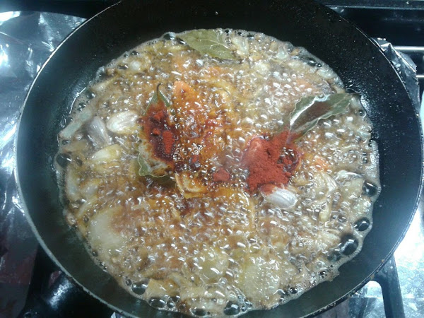 En el mismo aceite sobrante, añadir cebolla picada en juliana, las zanahorias previamente peladas y cortadas en rodajas, los ajos pelados, las hojas de laurel y freír unos minutos.