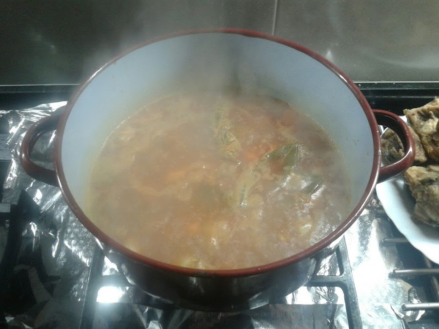 Pasar todo lo de la sartén a una cazuela, añadir las hierbas aromáticas, los granos de pimienta, una pizca de sal, la cucharada de pimentón y se deja sofreír unos minutos.