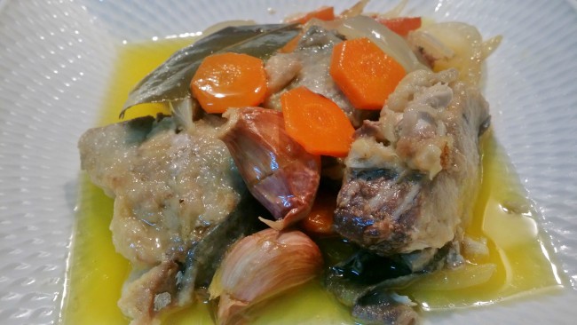 Esta receta es de una compa de trabajo y decidí probarla. En la receta original, se disponen las caballas en filetes pero cuando las pedí en mi pescadería, la pescadera me juró y perjuró que, en la receta tradicional, las caballas se disponen en rodajas porque así el hueso le da sabor a la carne mientras se cuece ¿Rodajas?. Así que fui salomónica y pedí una en filetes y dos en rodajas