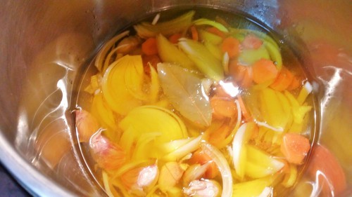 · En una cazuela ponemos a calentar el vinagre, el aceite, la cebolla, los ajos enteros partidos, la zanahoria partida en rodajas, la pimienta y el laurel.