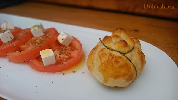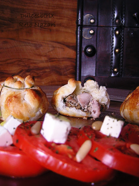 Yo he preparado tambien unos paquetitos de hojaldre que he rellenado con una cucharita de queso fresca, la mezcla preparada yparte de la caballa asada .Lo he hecho cortando un circulo de hojaldre, rellenandolo y cerrandolo con una ramita de cebollino. se pinta con huevo y se introduce en el horno hasta que se vean doraditos.
