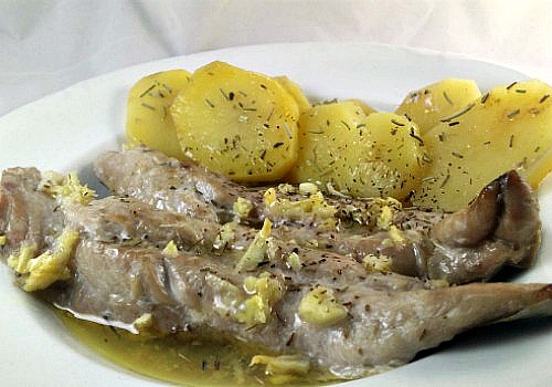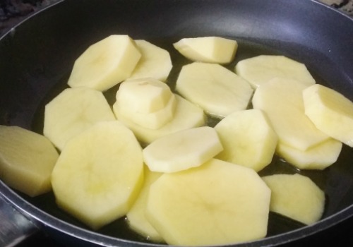 - Pelar las patatas y cortarlas en rodajas. Poner una sartén con aceite y freir un poco las patatas. Deben quedar duras y se terminan de hacer en el horno.