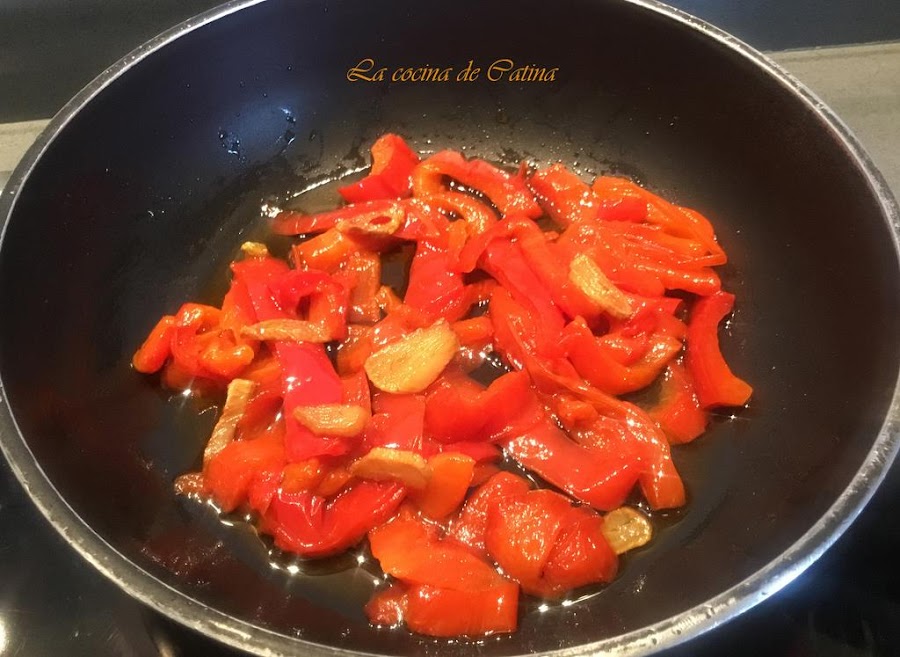 Lavamos y secamos los pimientos, les quitamos las semillas, los cortamos en tiras, y los ponemos en una sartén con aceite a fuego lento, cuando veamos que empiezan a blandearse, añadimos los otros dos dientes de ajo cortados en láminas, salpimentamos, rehogamos 4 o 5 minutos más, y apartamos y reservamos.