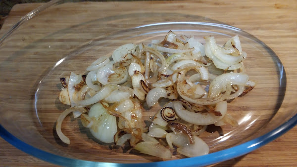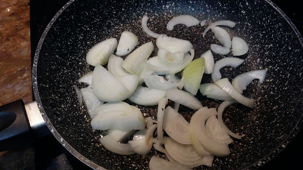 Poner la cucharada de aceite de oliva en una sarten y pochar la cebolla tapada.