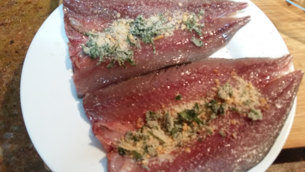 Poner un poco de la picada mezcla de almendras, perejil y pan rallado dentro de cada trucha o caballa.