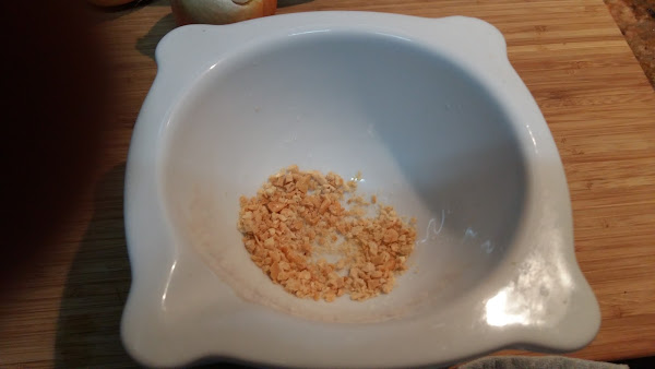 Picamos en un mortero las almendras, el pan rallado y el perejil