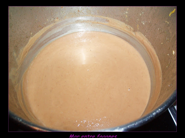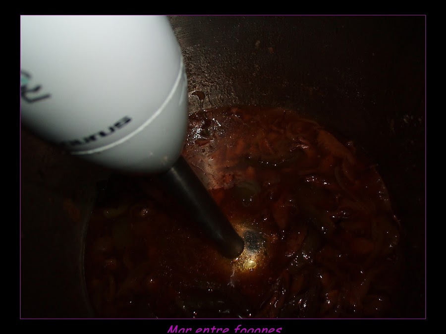 Sacamos la carne y trituramos la salsa con una minipimer y dejamos que reduzca un poco a fuego medio.