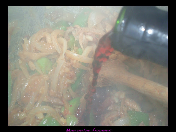 Añadimos un chorro de vino tinto y un chorrito de agua.