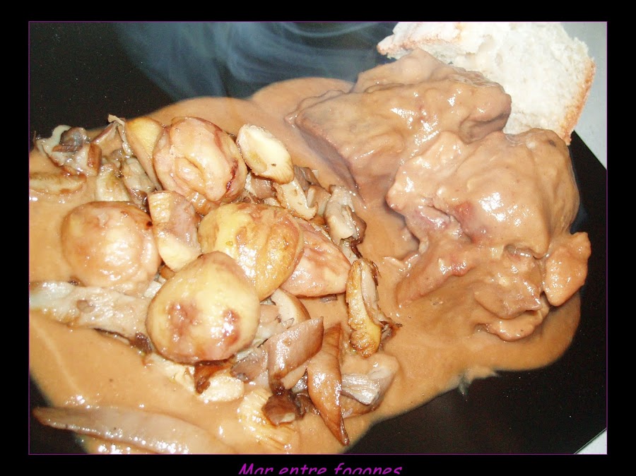 Servimos poniendo una cama de salsa, la carne y las setas salteadas con las castañas.