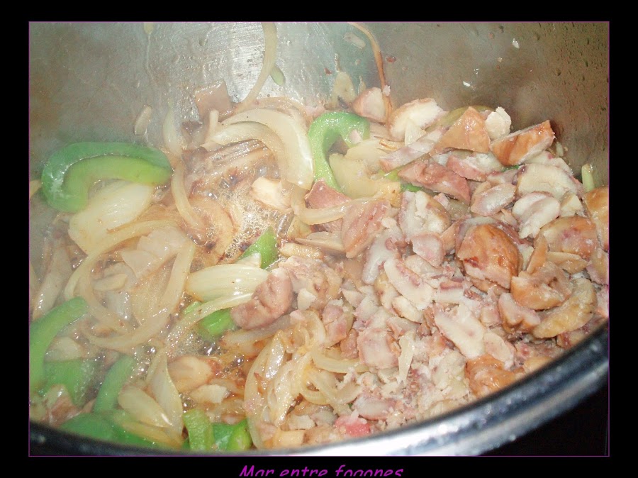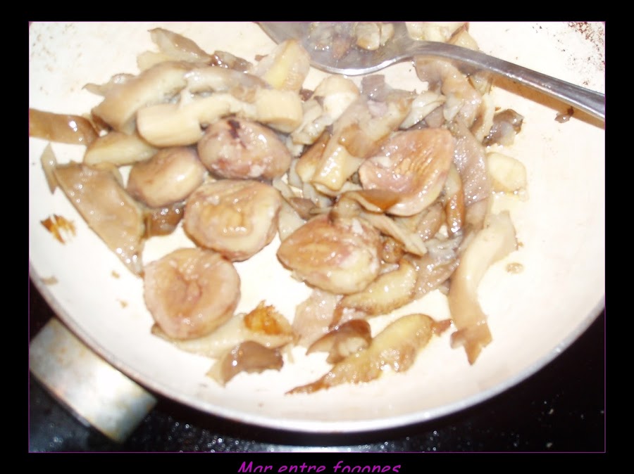 Cuando estan cocinadas añadimos las castañas para que cojan temperatura.