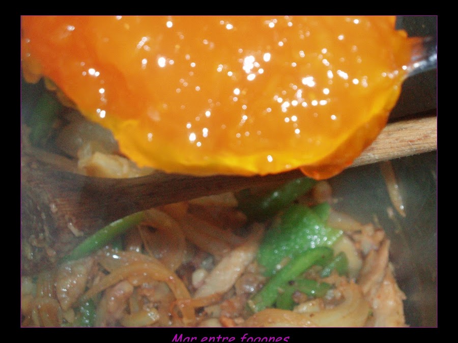 Cuando esta toda la carne dorada, ponemos carne, toda la cebolla, las castañas troceadas (dejamos unas pocas para servir como guarnición), unas pocas de setas troceadas y dos cucharadas soperas de mermelada de calabaza y naranja.