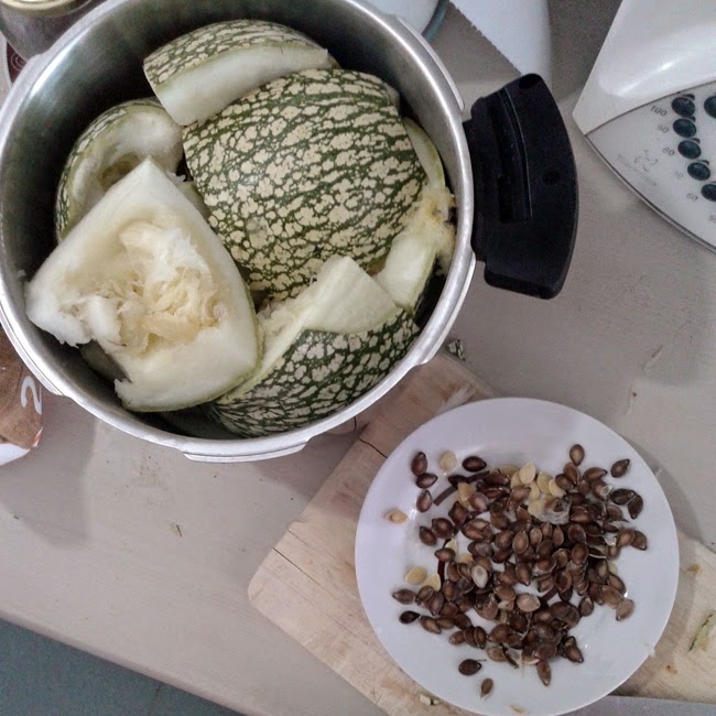 Si quieres guardar pepitas para plantar, recuerda hacerlo antes de cocerlas o serán inservibles. Las pepitas maduras son coriáceas y marrones, mientras las que todavía están verdes son más blanquecinas y blanditas. Como vas a tener que quitarlas de todos modos, es un buen momento para hacerlo porque la carne está tersa, y es posible que tras la cocción todavía quede alguna.