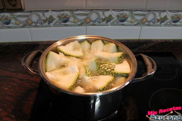 Ponemos la olla al fuego, a fuego medio y cubrimos con agua, dejaremos cocer durante una hora más o menos, hasta que la calabaza este tierna, este tiempo depende del tamaño que cortemos los trozos.