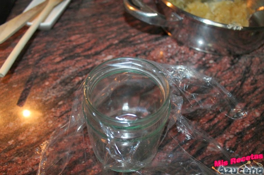 Cuando estén fríos los rellenamos con el cabello de Ángel y los tapamos, hay que tener cuidado de que no queden huecos, un truco para que no se te llenen los filos puedes poner un poco de film transparente en la boca u hacer un agujero.
