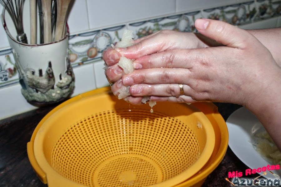 Cuando estén todos los trozos desmenuzados cogeremos puñados y los estrujaremos como si fuesen espinacas para quitarle el exceso de aguapara poder pesarlos, no tiene que quedarse completamente seca.