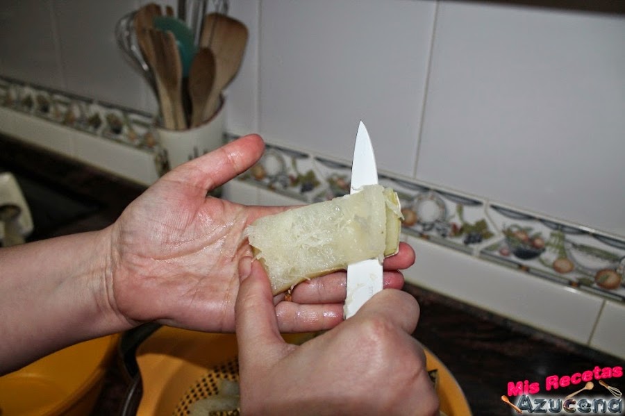Una vez la tengamos bien lavada la cortaremos en trozos de unos dos dedos de grosor y con ayuda de una cuchara de café le quitaremos las pepitas, una vez tengamos todos los trozos sin pepitas los pondremos dentro de una olla.