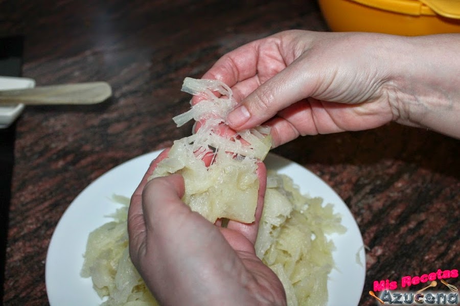 Una vez tengamos todos los trozos sin corteza, cogeremos de uno en uno y los iremos desmenuzando y colocando en otro plato.