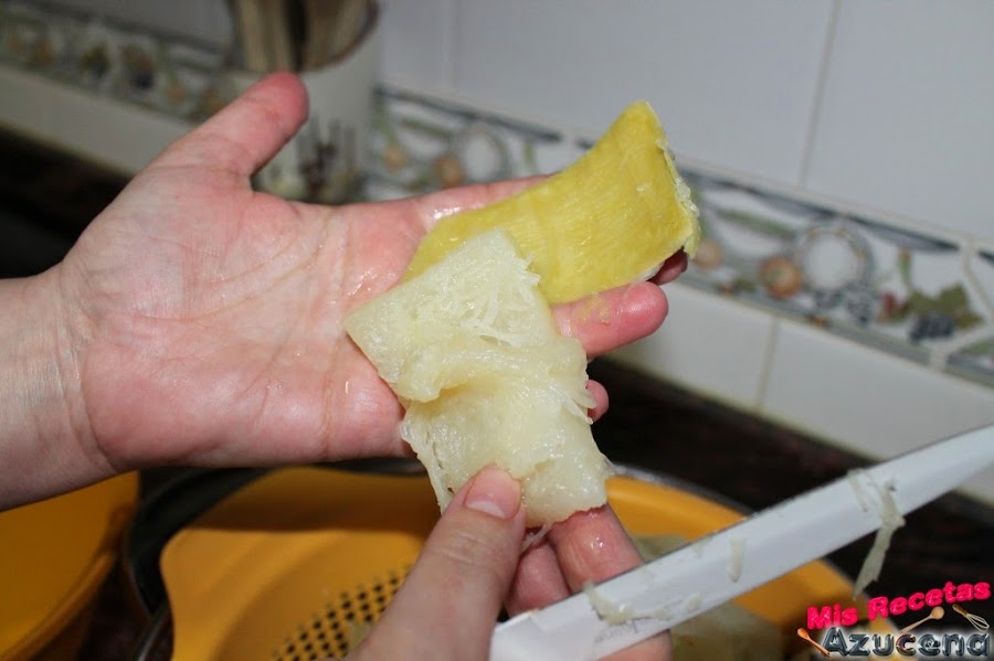 Pasada la hora cogeremos los trozos y pondremos la piel sobre la palma de nuestra mano y con ayuda de un cuchillo le quitaremos la piel, y si se nos ha pasado alguna pepita también se la quitaremos.