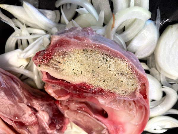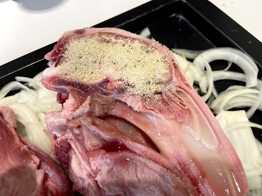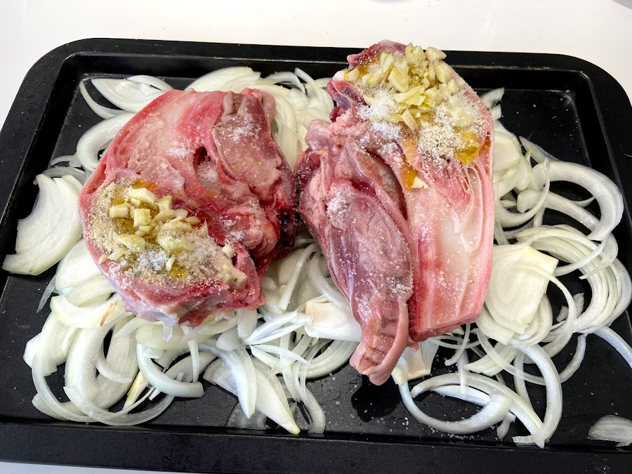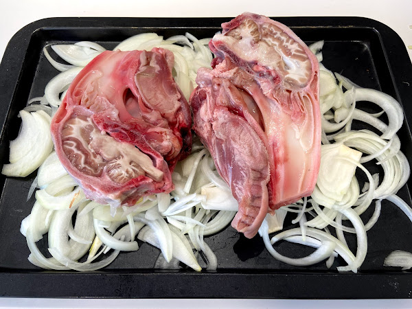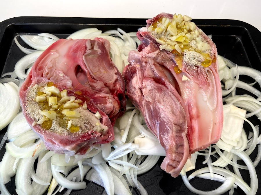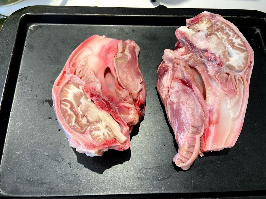 1 cabeza de cordero partida por la mitad, le podemos decir al carnicero que quite los ojos o que los deje, si os atrevéis yo sugiero que lo probéis.