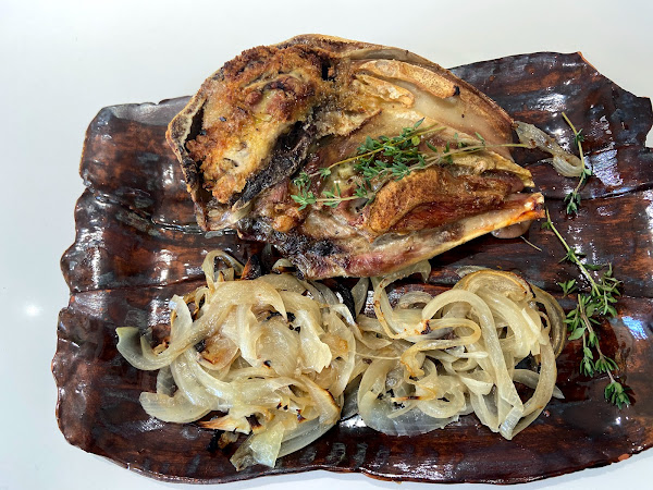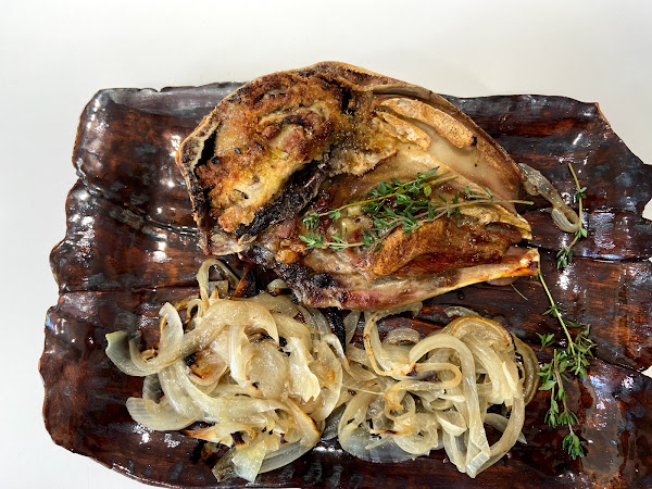 Transcurrido el tiempo de asado, emplatamos, poniendo la cabeza de cordero en un plato con la cebolla asada y unas ramitas de tomillo.