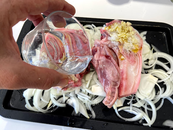 Se corta la cebolla en juliana y se pone en el fondo de la placa, sobre la cebolla se colocan las dos mitades de la cabeza.