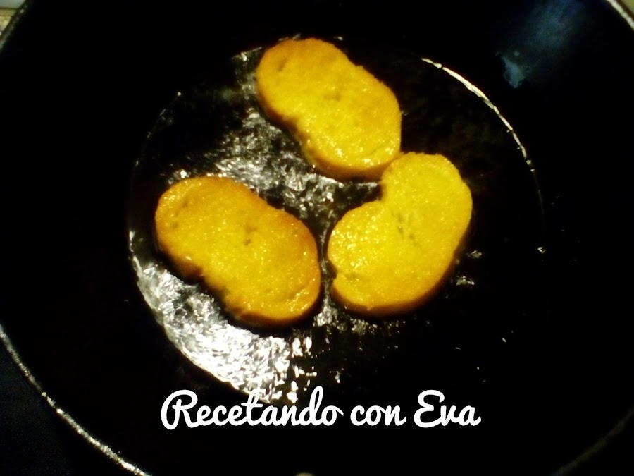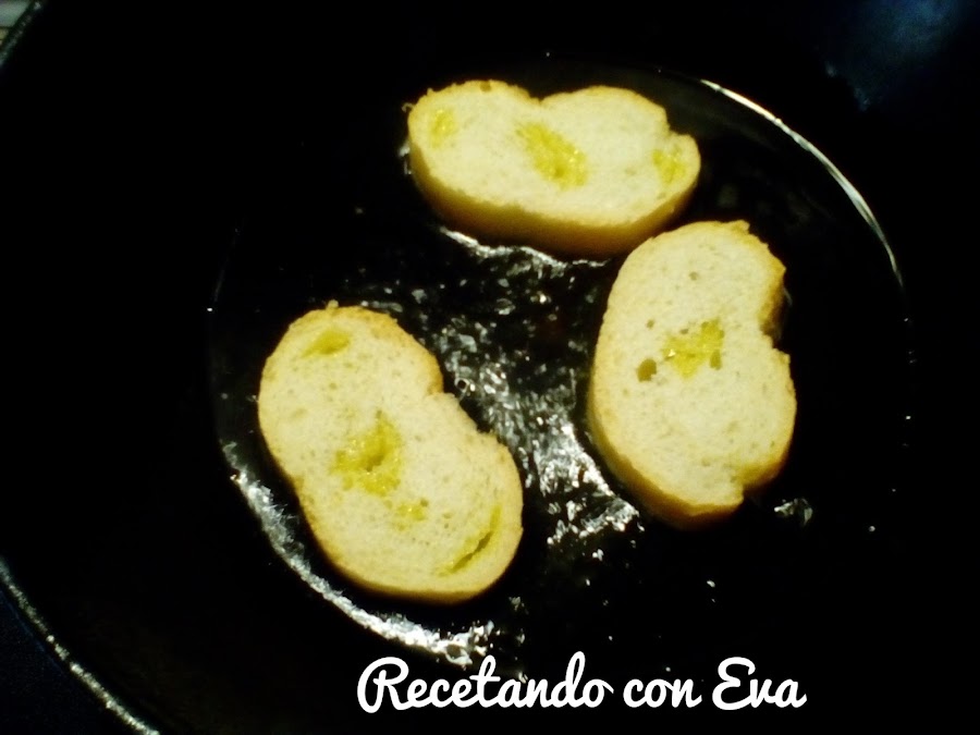Mientras, en una sartén echamos aceite y freímos las rebanadas de pan (pringá) por ambos lados y reservamos.