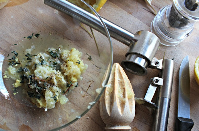 En un bol, ponemos el zumo del limón, los ajos machacados, una hojas de tomillo, la pastilla de caldo (o un poco de caldo) y mezclamos.