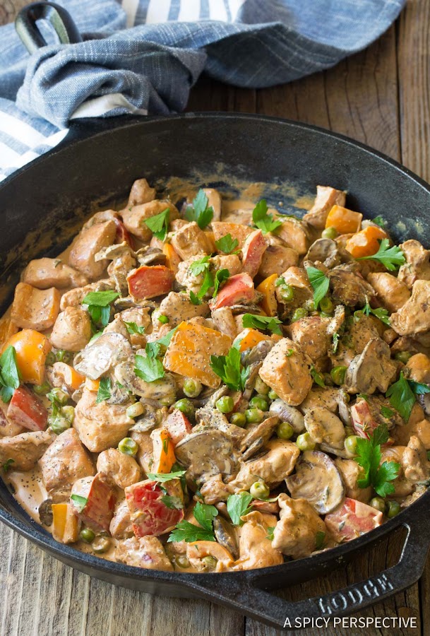 Agregue los pimientos, el tomillo, el pimentón y la nuez moscada. Revuelva y cocine otros 2 minutos. Luego mezcle el queso crema, el caldo de pollo, el jerez y los guisantes. Revuelva y cocine a fuego lento hasta que el queso crema se derrita en el líquido crea una salsa suave. (Si usa queso crema sin grasa, es posible que tenga que batirlo un poco para que se incorpore en la salsa.)