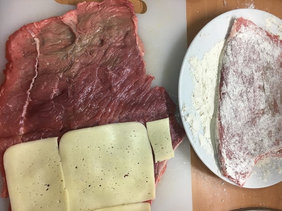 Lo importante es escoger carne de cadera, buenos filetes finos, aplastarlos con una piedra o maza para hacerlos aún más finos, rellenarlos con lo que se desee y empanarlos al estilo de las croquetas; a saber, pasados por harina, huevo batido y pan rallado.