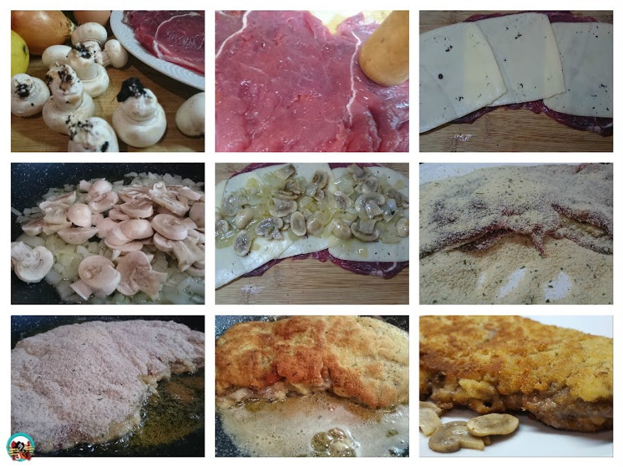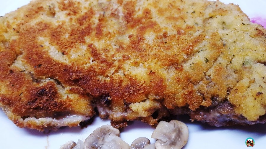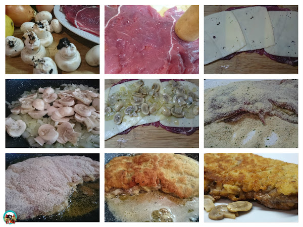 Consejo: para que los cachopos no se rompan, trátalos con cuidado y elabora todos los pasos utilizando platos grandes, cuando los pases por los huevos y el pan rallado. Si quieres, también le puedes añadir un poco de jamón serrano sobre los champiñones y las cebollas, antes de cubrirlo con otro filete y empanarlo.