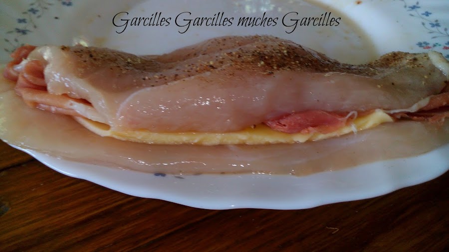 Poner encima de una de las pechugas, una loncha de queso y otra de jamón