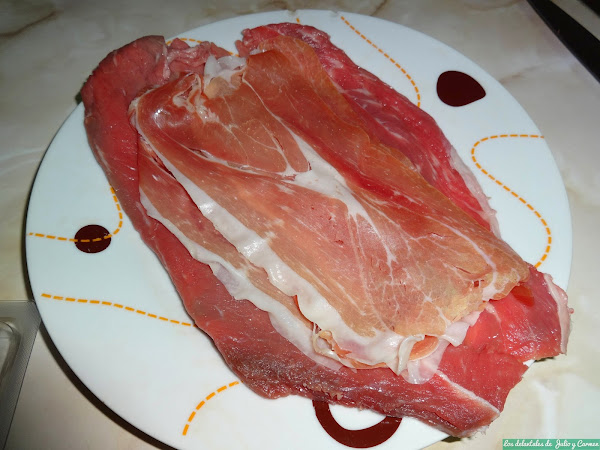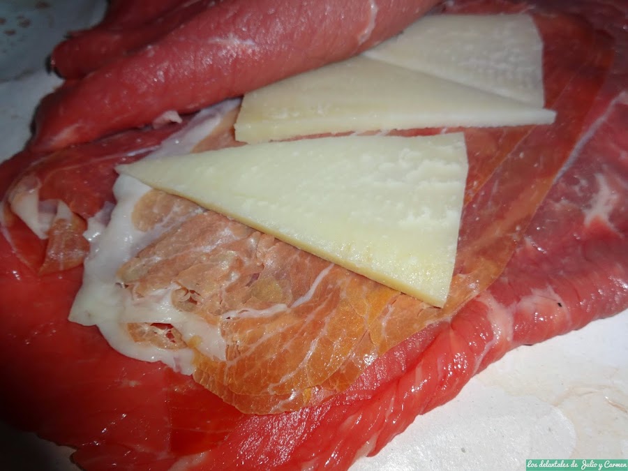 Colocamos encima de uno de los filetes, unas lonchas de jamón serrano, y encima de estas, el queso que hayamos elegido, teniendo cuidado de no ponerlo muy al borde, ya que al freírlo podría salirse.
