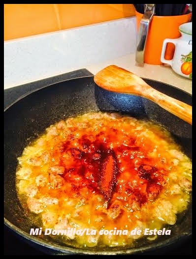 Esperamos rehogando un rato que se vayan haciendo los corazones. Cuando pase un rato añadimos el pimentón. Mover bien.