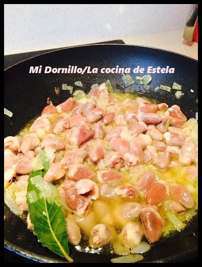 Aparte ponemos los corazones en un bol con sal, pimienta y el brandy ( o vino) y dejamos macerar, mientras se nos hace la cebolla.