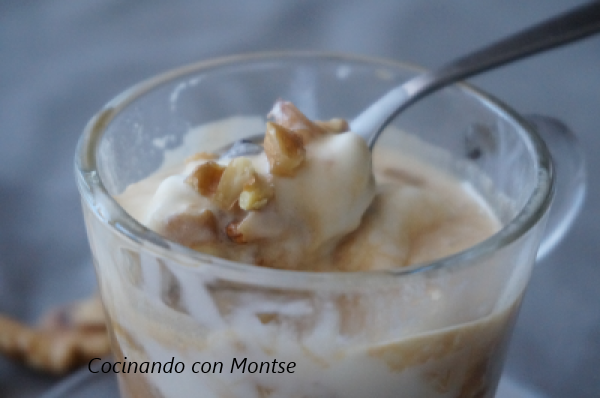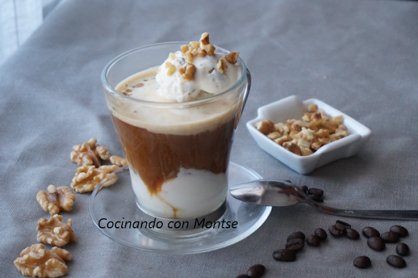 Preparamos justo antes de servir el postre el café, lo vertemos en la copa sobre el helado. No lo cubrí todo, me guste que quede helado por encima para ir mezclando café, helado y nueces. Pero se puede hacer hasta cubrir todo. Yo puse 2 bolas de helado.