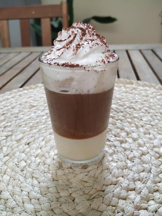 En un vaso ponemos un par de dedos de leche condensada vegana, preparamos nuestro café solo, y lo vertemos encima de la leche condensada con cuidado, ahora solo falta decorar con nata montada (crema de leche) vegetal Schlagfix y espolvorear un poco de cacao en polvo por encima.