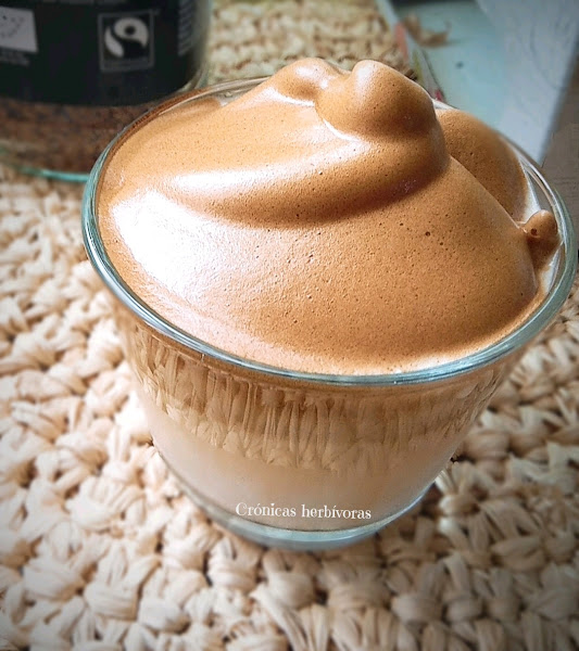 3. Prepara una taza de bebida vegetal (hielo opcional) y con una cuchara vierte la espuma de café por encima.