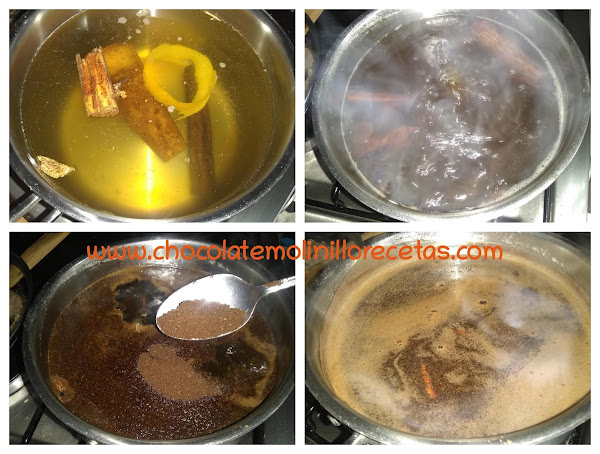 Procedimiento:Colocamos el agua en una olla, añadimos la canela, clavos de olor, piloncillo y cáscara de naranja (yo la retiro de la naranja con un pelador de papas y procuro no poner la parte blanca).