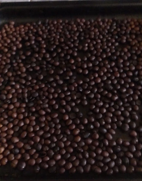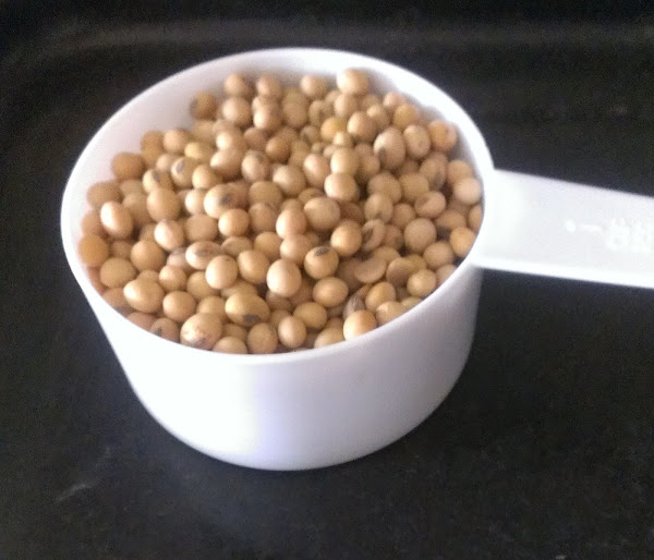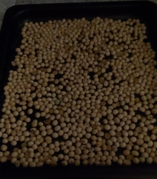 Escogemos la soya y la lavamos bien, por lo menos tres veces, la colamos y la dejamos secar; una vez seca podemos tostarla colocándola en un sartén y llevándola al fuego, removiendo con una cuchara de madera; o como en mi caso, la colocamos en una placa distribuida uniformemente.
