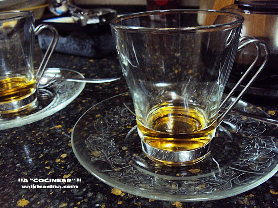 Vertemos en la taza o vaso elegido aproximadamente un dedo de whisky, según gustos. Lo que ves en la foto es el equivalente a medio vaso de "chupito".