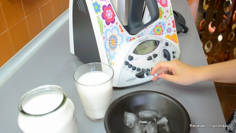 Incorpora al vaso batidor: el vaso de leche, los hielos y el azúcar.