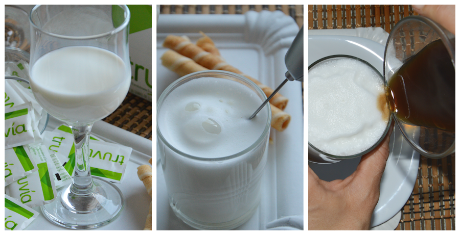 Calentamos leche sin llegar a hervir, y llenamos 1/3 del vaso, o de la copa donde hacemos el café. (foto1)