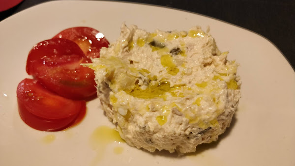 De primero Ensaladilla rusa. Estaba muy buena. Junto con la tortilla es uno de los éxitos del local. Predomina mucho el bonito, un poco de patata y pepinillo. Muy ligera y muy rica.