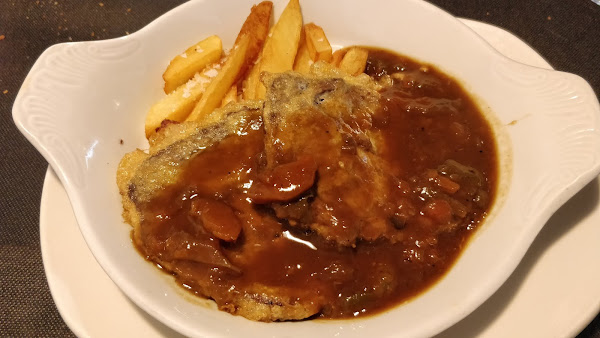 Lengua en salsa. Muy tierna, acompañada de una salsa de carne sabrosa y unas patatas caseras buenísimas.