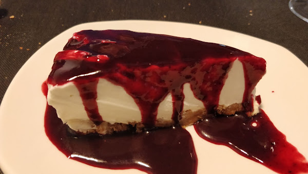 El otro postre fue la Tarta de queso. Casera y rica, un poco menos de coulis de frambuesa la hubiese mejorado.