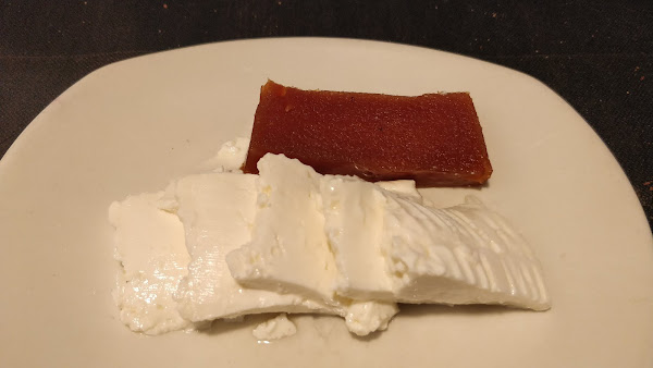 Postres: Queso fresco con membrillo / Tarta de queso / Tarta de chocolate / Fresas con nata (crema de leche) / Natillas / Piña.